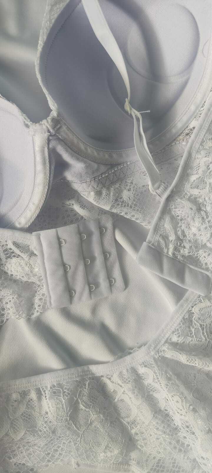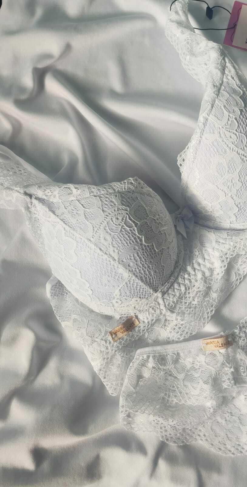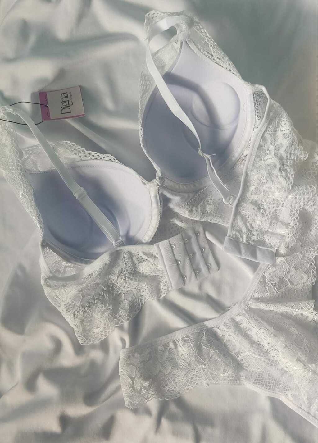 O sutiã possui fechamento em 3 ilhós com 3 níveis de regulagem, garantindo ajuste perfeito ao corpo. Possui aro e bojo além das alças com regulagem. Já a calcinha, em modelo calesson mais cavado, é inteiramente confeccionada em renda com fundo 100% algodão – para conforto e cuidado com a pele.