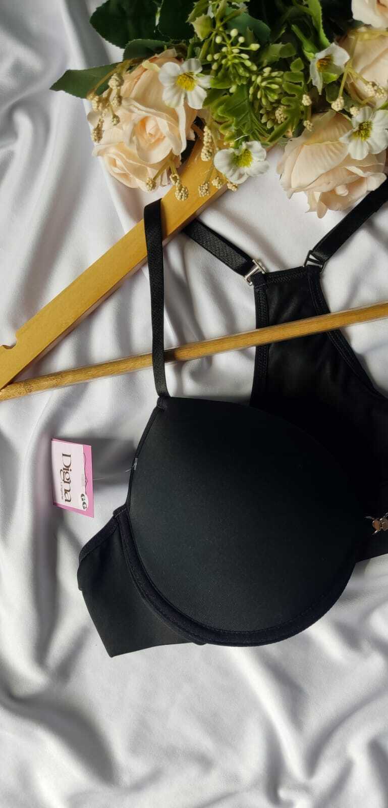 Sutiã confeccionado em malha de poliamida. Modelo nadador, confere fechamento frontal, possui bojo, alças em elástico com reguladores, barra em elástico.
